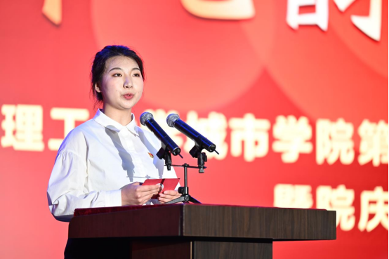国家奖学金获得者宋李姣同学代表在校生发言,城院给予了同学们充实的学习状态和浓厚的学习氛围,为同学们搭建了挥洒青春智慧的广阔舞台,作为新一代青年,城院人有十足信心为城院更加美好的明天添彩,为时代的新征程不懈奋斗。