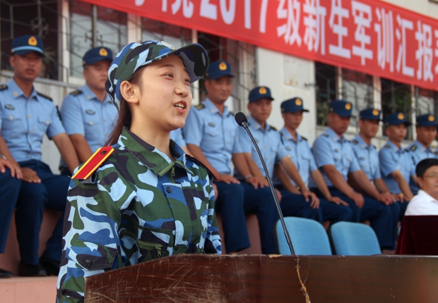 艺术与传媒学院广播电视学专业1702班谭雨晗同学代表新生发言,她对十天来承担和保证训练任务圆满完成的部队教官们表示由衷的感谢,决心在今后的学习生活中坚持和发扬在军训中学到的不怕苦不怕累的精神,圆满完成学业。