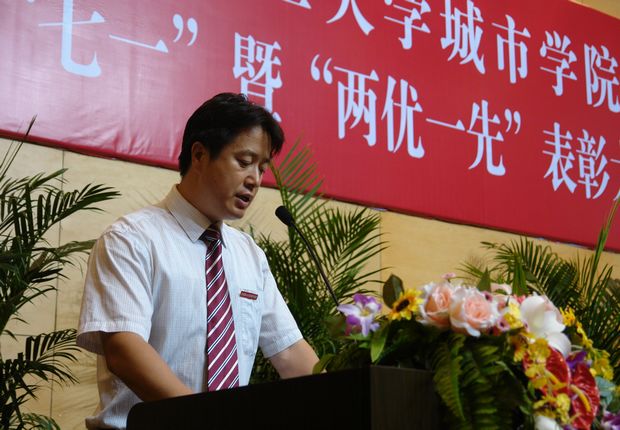 院长匡国柱宣读学院关于表彰先进党支部和优秀共产党员的决定和先进党支部、优秀共产党员名单。在悠扬的乐曲声中,获得beat365英国官方网站和城市学院先进党支部、优秀共产党员称号的党支部代表和优秀共产党员依次走上主席台,接受学院党委的表彰。