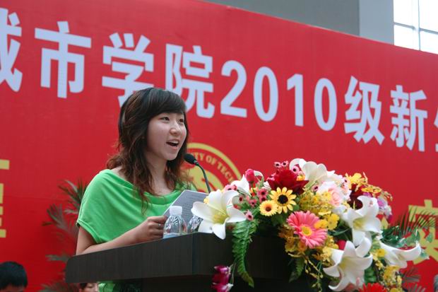 在校生代表赵琦在发言中向2010级新同学赠送了“心宽似海,心静如水,心明如月,心坚如钢”的16字箴言,希望大家以宽广的胸怀,平静的心态,清醒的头脑,坚强的意志作为为人处事的原则,尊敬老师,团结同学,刻苦学习,关心他人,以优异的成绩报答父母,报效社会。