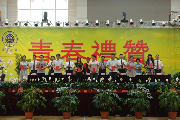 在欢快的乐曲声中,获得省、市和学院优秀毕业生称号的毕业生代表依次走上主席台,接受学院领导的表彰和师生们的祝福。