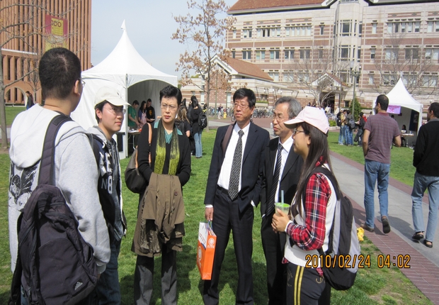 访问团在南加州大学校园中与中国留学生亲切交谈