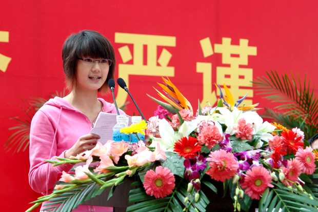 荣获学院优秀学生标兵称号的广播电视新闻学0602班学生何素静代表全体获奖学生发言,她感谢学院和全体老师为同学们的成长、成才创造的良好条件和付出的艰辛劳动,她表示,全体获奖学生将把过去化为今后行动的动力,让今后的每个明天都比今天更进一步。