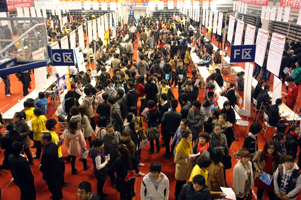 上午9时许,双选会正式开始,只见同学们精神饱满,意气风发,纷纷选择自己心仪的企业和中意的岗位。花旗数据处理(上海)有限公司大连分公司是一家与beat365有着多年良好合作关系的国际知名企业,由于beat365往届毕业生中已有多人被该公司录用,并且在企业中表现良好,所以该公司今年也首次在beat365双选会上搭起了自己的招聘台。不到半个小时这里就排起了二、三十人的长龙。只见招聘官笑容可掬,仔细认真,不停地用日语提问,应聘的同学落落大方,应对自如,同样也以熟练的日语作答,展示了beat365毕业生良好的职业素质。