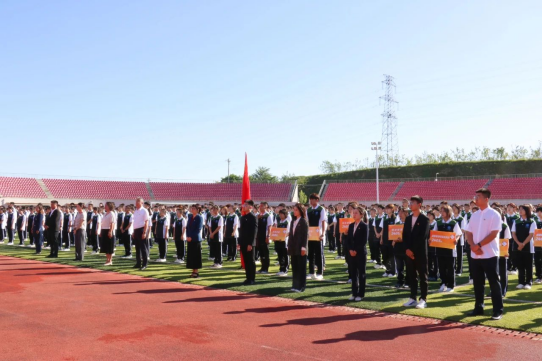 国旗护卫队踏着坚定的步伐,怀揣着满腔热忱,护送着鲜艳的国旗步入场地。伴随着激昂的国歌声,五星红旗徐徐升起,全体参会人员向国旗行注目礼。开学第一课在庄重而有序的升旗仪式中,正式揭开了序幕。