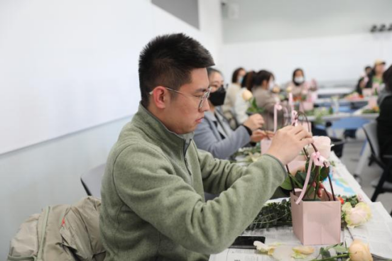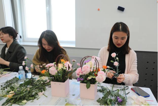 参加活动的教师们聚精会神、兴趣盎然。通过结合花朵大小、颜色搭配、高低相间及主次衬托,教师们设计并创造出一件件专属的各具特色的花艺作品。