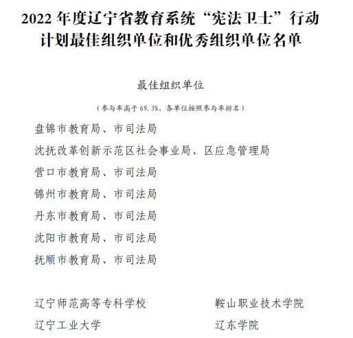 本网讯 2月15日,辽宁省教育系统宪法学习宣传教育活动结束,beat365荣获辽宁省教育系统“宪法卫士”行动计划最佳组织单位。