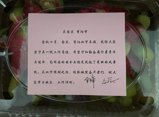 本网讯 10月1日上午,副院长宋辉、邹亚新代表学院在行政楼大厅为国庆期间驻守校园的全体辅导员、各机关、后勤集团等教师、员工发放慰问品,送去温暖和祝福,对大家的辛苦付出表示感谢。