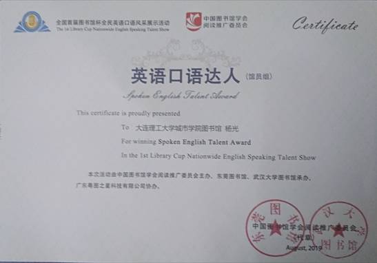 本网讯 日前,在『全国首届“图书馆杯”全民英语口语风采展示活动』中,学院图书馆馆员杨光脱颖而出,荣获“全国首届‘图书馆杯’全民英语口语大赛”馆员组“英语口语达人”奖。该活动是一项面向全国各类图书馆读者开展的将图书馆宣传与英语口语竞技相结合的风采展示活动,由中国图书馆学会阅读推广委员会主办。