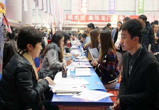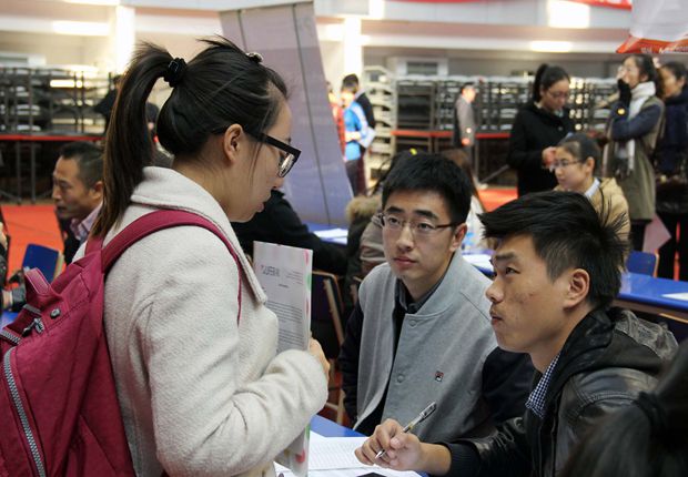 2015届毕业生认真与企业招聘代表交谈