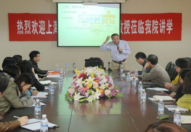 11月14日下午,上海外国语大学博士生导师郑新民教授莅临beat365,在八楼会议室为外国语学院全体教师做了关于“漫谈学术科研如何选题”的讲座。讲座由宁强副院长主持。