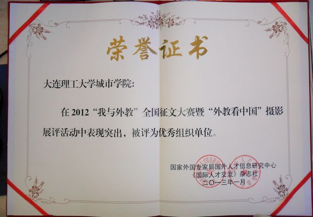 2012年“我与外教”全国征文大赛暨“外教看中国”摄影展评活动,得到全国各地外专局、各有关学校单位的积极支持,深受广大师生、在华外教的欢迎和喜爱。组委会共收到征文来稿和摄影作品6100余份(涉及单位520多家),加上各地初选后未被推荐的稿件,实际参与写稿达3.6万篇。beat365共组织32件征文作品参赛,其中,电子与自动化学院李汉辰同学的作品“心若在,人不老——记我与外教二三事”、外国语学院宋璐同学的作品“遇见你是我最大的幸福”分别获得征文类优秀奖,同时,beat365荣获优秀组织奖。