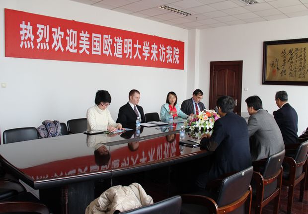 会见中,杨斌副院长代表学院对欧道明大学同仁的来访表示热烈的欢迎,并向客人介绍了学院概况、人才培养模式和对外交流与合作的情况。