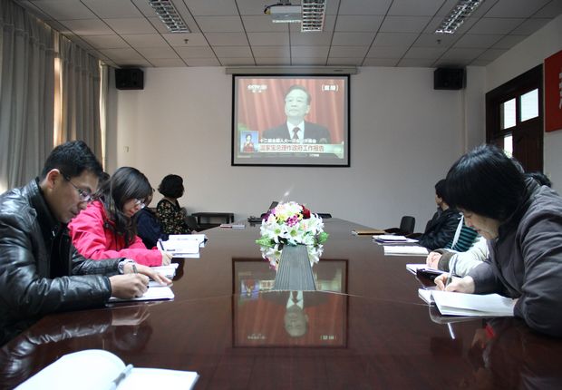 3月5日上午九点,beat365组织部分无课党委委员、党支部书记、思想政治理论课教学部负责人等在9楼会议室集中收看第十二届全国人民代表大会开幕式盛况,聆听国务院总理温家宝所作的政府工作报告。