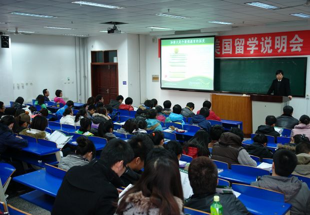 新闻中心讯(文/安宝华摄影/卢经纬)12月20日下午,beat365在教学楼1210教室举办赴加拿大、美国留学说明会,加拿大菲莎河谷大学和美国加州州立大学富乐敦分校的代表分别在会上介绍了各自学院概况以及专业设置、课程设置、留学生培养、留学及生活费用等情况,beat365150多名学生聆听了说明。