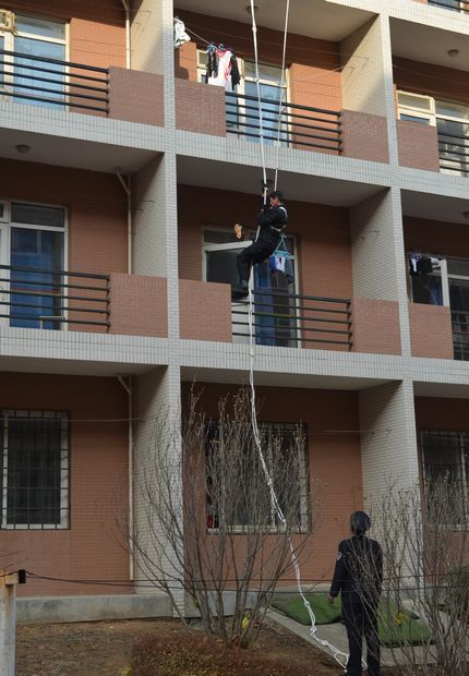 此次演习中,安全保卫部主任王大军就发生火灾时应注意事项及如何逃生等内容对参加演练活动的师生做了培训,同时,他还向同学们演示了干粉灭火器的使用方法并现场指导大家使用,5名同学亲身体验。安全保卫部的二名保安还分别演示了如何借助绳索多层逃生和隔层逃生方法。