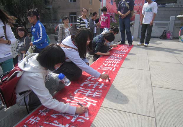 同学们在条幅上签字