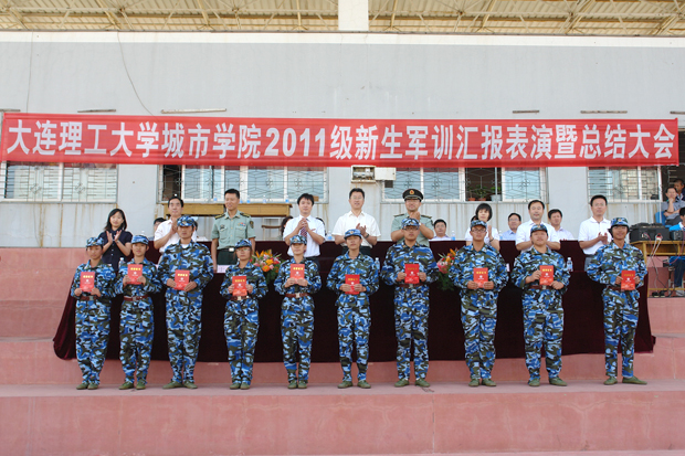 2011级新生军训会操表演暨总结表彰大会于9月3日下午2点在学院体育场隆重举行。院党委郭玉铸书记,副院长杨斌、张明君、战军,院长助理宋辉,沈阳军区综合训练基地军训办副主任于江及各分院负责人参加了大会。会议由学院党群工作部主任赵姝婕主持,学生工作部主任李宪起宣读荣获本次军训先进集体和先进个人名单,大会对军训中涌现出的20个先进集体和76名先进个人进行了表彰。