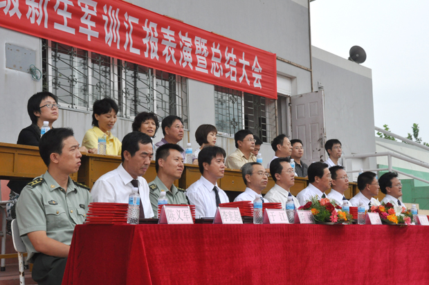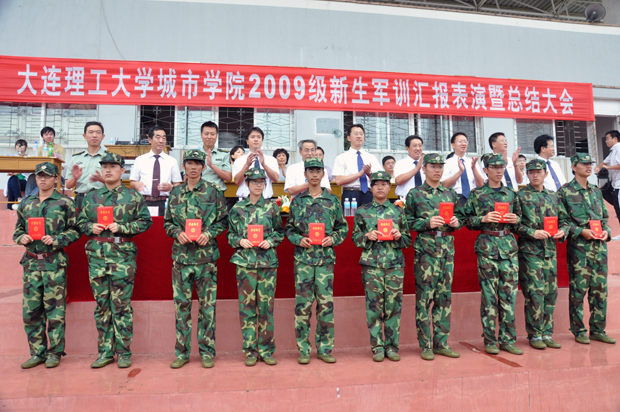 2009级新生军训会操表演暨总结表彰大会于9月5日下午2点在学院体育场隆重举行。学院领导匡国柱、郭玉铸、杨斌、王铁成、沈海龙、李宪起、王玉林、王善坤以及各分院负责人和沈阳军区综合训练基地军训办副主任于江上校、大队长陈义军中校等参加了大会。会议由学院团委书记赵姝婕主持。会议首先对军训中涌现出的先进集体和先进个人进行了表彰。