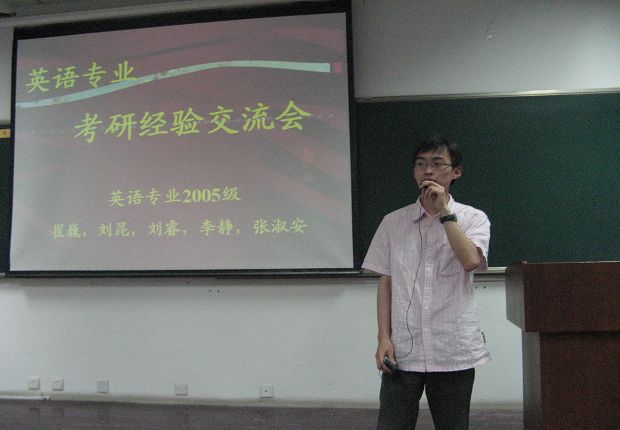 为了认真贯彻学院“多元化”的人才培养目标,使同学们更加详尽地了解考研信息,掌握考研动态,高效地备考2010年研究生入学考试,外国语学院英语专业教研室于6月10日在1310教室组织了英语专业考研经验交流会。交流会由英语专业教研室主任宁强老师主持,邀请英语专业教研室张丹老师及今年考入大连海事大学、大连外国语学院、福州大学、西南民族大学、沈阳师范大学的5名同学,与到场的近150名学生分享他们考研的“心路历程”。