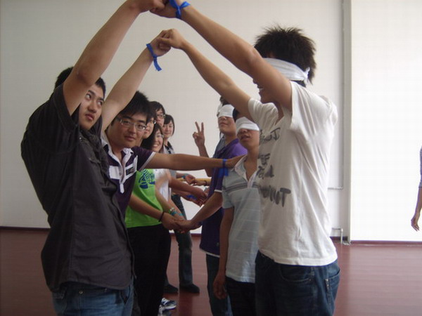 (团体成员做“盲行”活动)