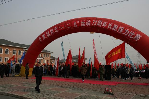 为纪念“一二·九”运动73周年,缅怀革命先烈坚强不屈的斗争精神和爱国主义热忱,进一步贯彻落实科学发展观,增强全民健身意识,由大连经济技术开发区教育卫生局主办的纪念“一二·九”运动73周年长跑接力赛于12月9日在开发区内举行,共有60多个单位的1000余人参加。