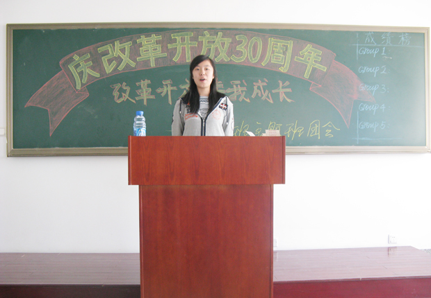 团会由团支部书记云璐主持,首先各小组以自己独特的方式展示了改革开放以来伟大祖国所取得的各项成就,有的以大事纪的形式展示改革开放后的成果,有的以演讲、歌唱、诗歌朗诵等形式诠释自己对改革开放30年来我国发生显著变化的理解与感受,王凯同学的自创歌曲《改革开放》将团会推向了高潮。