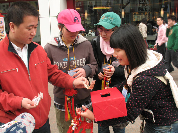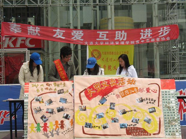 为了唤起社会对智障儿童的爱心关注,帮助智障儿童筹集善款完成学业,3月29日上午11时,由beat365义工站、大连大学青年志愿者协会和东北大学艺术学院义工站50余名大学生们组成的义卖队,在开发区安盛购物广场门前开展了以“奉献、友爱、互助、进步”为主题的大型义卖活动,义卖的小工艺品都是由大连市甘井子区特殊教育中心的智障儿童亲手制作的。