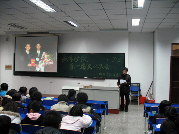 大会由学院团委书记助理孙磊同学主持,城市学院义工站发起人之一哈智强同学首先作义工工作报告,对学院义工工作进行了全面的回顾和总结,并对今后的义工工作提出设想和规划。随后各院(系)义工组组长依次上台与大家见面,表示了要将义务工作进行到底,服务社会,服务他人的愿望与决心。优秀义工代表介绍了各自的工作经验,用自己的亲身经历告诉大家奉献就是快乐,服务就是幸福。随后,与会义工以短信的方式向中国红十字总会发送了爱心捐助。