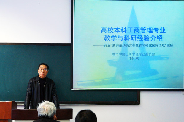 1月4日上午,工商管理专业委员会邀请东北财经大学工商管理学院李怀斌教授为beat365工商管理专业的老师们进行培训。此次培训的主要内容是高校本科工商管理专业教学工作,同时李教授又与教师们一起分享了他本人参加的首届“新兴市场的营销教育和研究国际论坛”的收获,使在座的年轻教师接触到了当今国际国内工商管理专业最前沿的教育教学理念与方法。