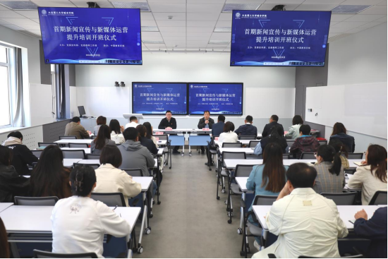 本网讯 4月29日,学院在管理楼308智慧教室举行首期新闻宣传与新媒体运营提升培训班。党委宣传部部长暴丰主持开班仪式,党委教师工作部主任张未萌作开班动员讲话。