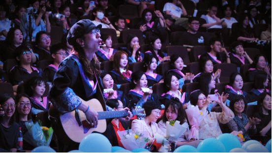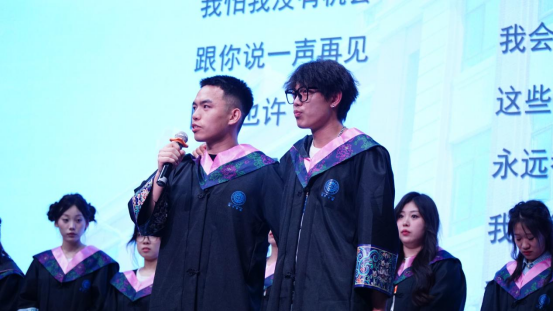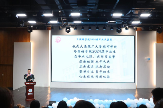 毕业班学生代表依次上台分享自己的毕业感悟,感谢学校、老师、同学们过去四年的帮助与陪伴。他们表示,将带着外国语学院的祝福与期待,坚定信念、脚踏实地,向着梦想前进。