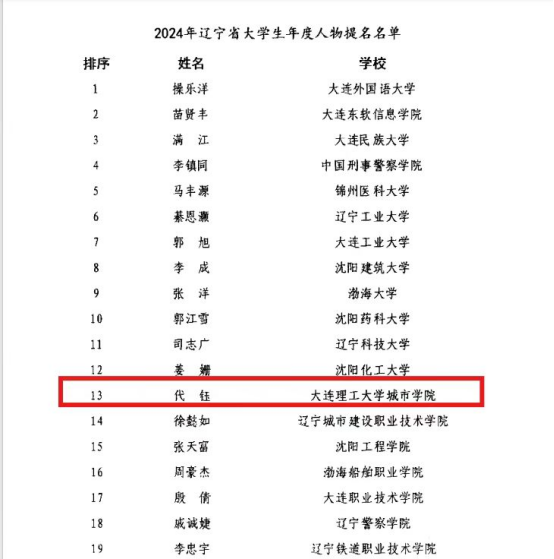 2024年辽宁省大学生年度影响力人物、年度人物推选展示活动于今年7月启动,经自主申报、学院审核、学校推荐、专家评审、现场推选展示等环节,从全省高校遴选出大学生年度影响力人物8名,大学生年度人物21名,大学生年度人物提名19名。