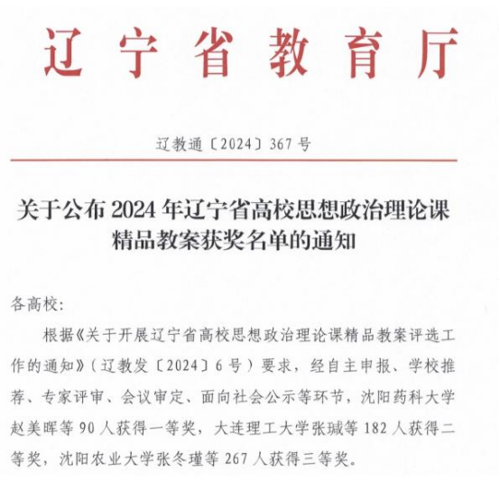 本网讯 近日,辽宁省教育厅公布了2024年辽宁省高校思想政治理论课精品教案获奖名单,beat365教师荣获二等奖1项、三等奖1项。