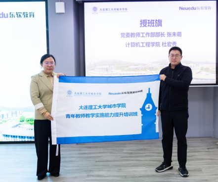 党委教师工作部部长张未萌向教师代表杜宏秀授予班旗