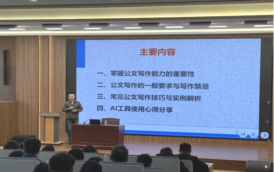 李宪坡讲解了公文写作在日常工作中的关键作用,通过详细分析公文写作的一般要求、写作禁忌与写作技巧,并结合日常工作案例深入浅出地传授教职工实用的公文写作方法。此外,他还分享了AI工具在公文写作中的巧妙应用,帮助提升日常工作效率。