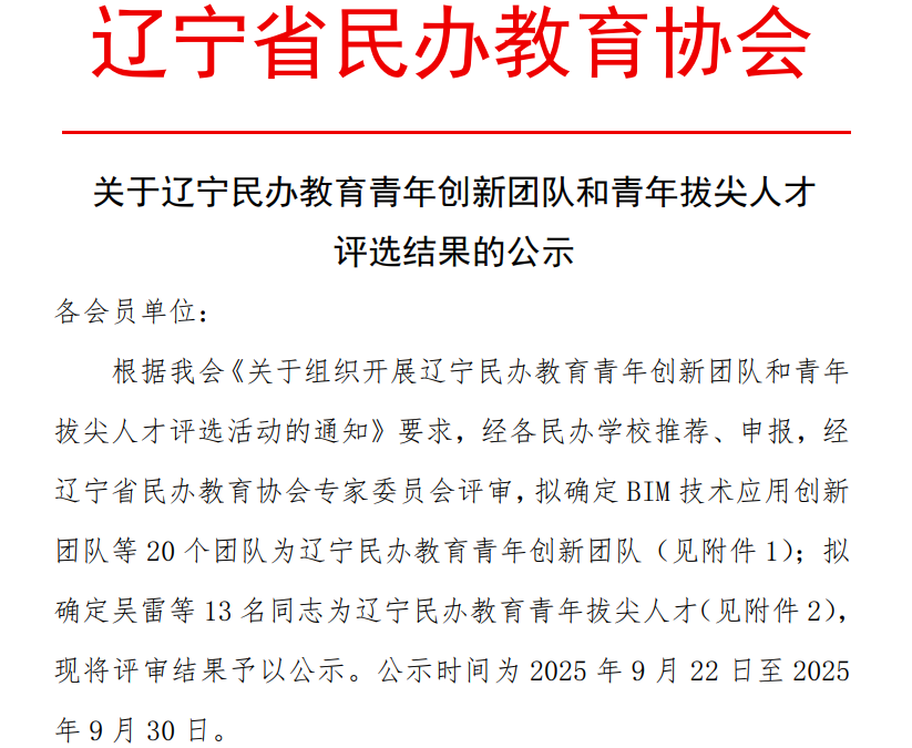 本网讯 9月22日,辽宁省民办教育协会公布最新评选结果,beat365栾兰老师领衔的“城乡宜居环境研究创新团队”获评“辽宁民办教育青年创新团队”。许明明老师当选“辽宁民办教育青年拔尖人才”,实现人才与团队建设双突破。