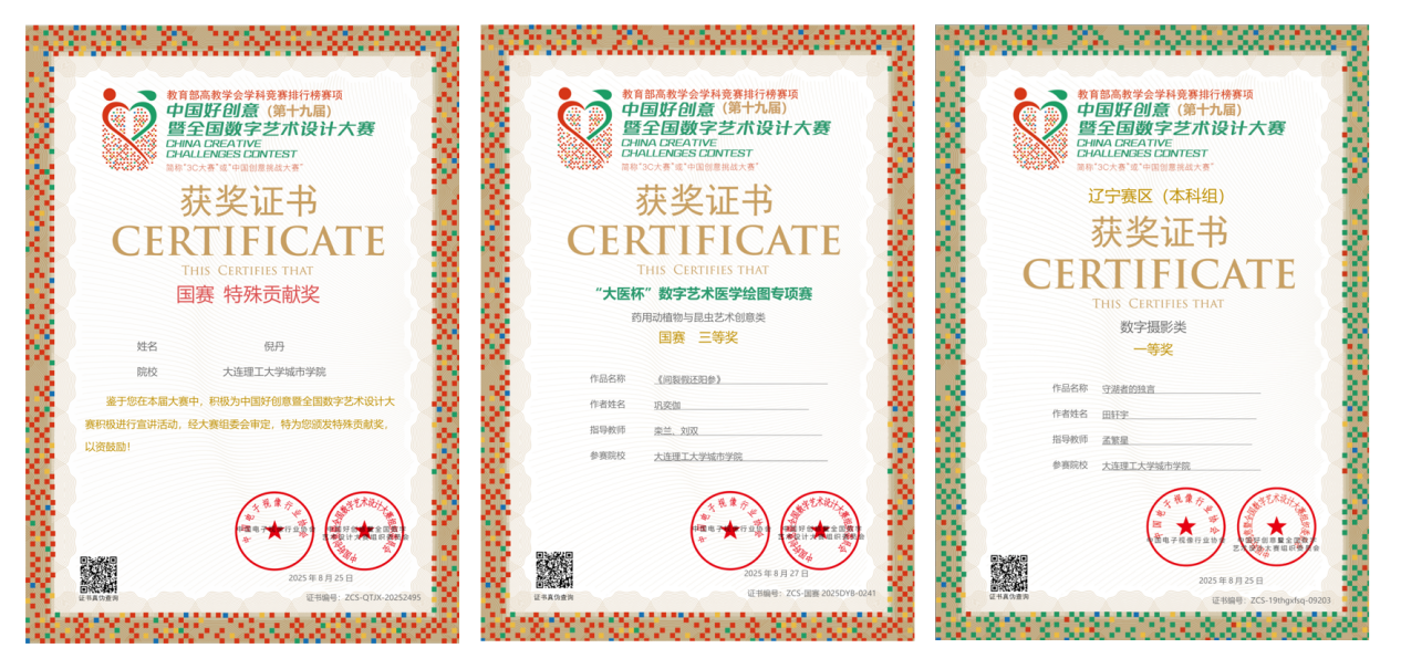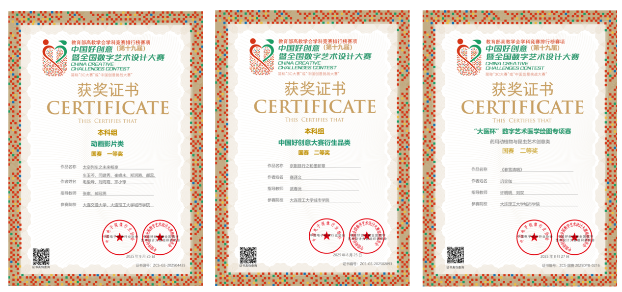 由张琪、郝冠男教师指导,学生车玉岑、闫建秀、崔峰未、郑润港、郝蕊、毛俊峰、刘海霞、宗小琢的设计作品《太空列车之未来畅想》荣获动画影片类国赛一等奖。由武春沅教师指导,学生商译文的设计作品《京剧旦行之粉墨新章》荣获中国好创意大赛衍生品类国赛二等奖。由许明明、刘双教师指导,学生巩奕伽的设计作品《春雪清咽》荣获大医杯数字艺术医学绘图专项赛国赛二等奖;由栾兰、刘双教师指导,学生巩奕伽的设计作品《间裂假还阳参》荣获大医杯数字艺术医学绘图专项赛国赛三等奖。艺术与传媒学院倪丹教师获国赛特殊贡献奖。