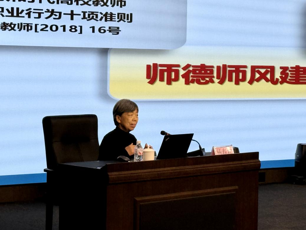 杨春秋教授围绕师德建设、课堂教学、教研室赋能三大核心展开讲解。她结合《新时代高校教师职业行为十项准则》等文件要求,通过典型正面范例与违规警示案例相结合的方式,清晰界定师德红线与职业底线;聚焦教学设计、教学方法与考核评价,以材料力学等课程为例,解读如何实现知识传授、能力培养与价值塑造的有机融合;同时强调了教研室通过集体备课、教学研讨以及赛事培训等重要性,师德师风是教师的立身之本,教学技能是育人的核心支撑,二者相辅相成。