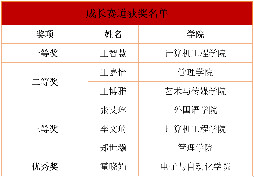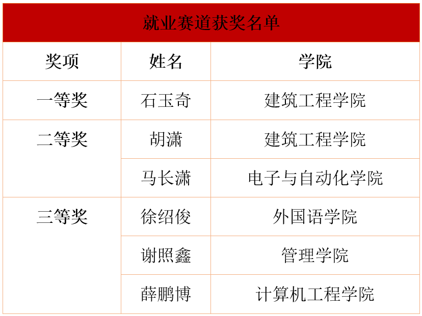 计算机工程学院软件工程2303班王智慧荣获成长赛道一等奖,建筑工程学院建筑学2201班石玉奇荣获就业赛道一等奖。
