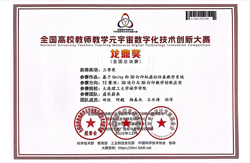 在本次大赛中,计算机工程学院教师李玲、张程、邹萍组成的“媒算创新队”凭借作品《智绘算:图像运算交互仿真系统》荣获T3赛项(元宇宙·3D/XR技术与教育教学创新应用)二等奖;教师田欣、何毅、杨真杰、王水涛、刘洋组成的“虚实蔚来”团队凭借作品《基于Unity的3D打印机虚拟仿真教学系统》荣获T2赛项(3D设计与3D打印教学创新应用)三等奖。