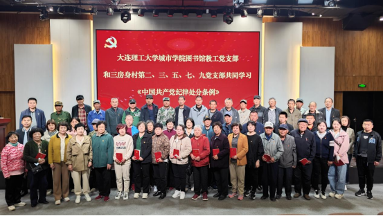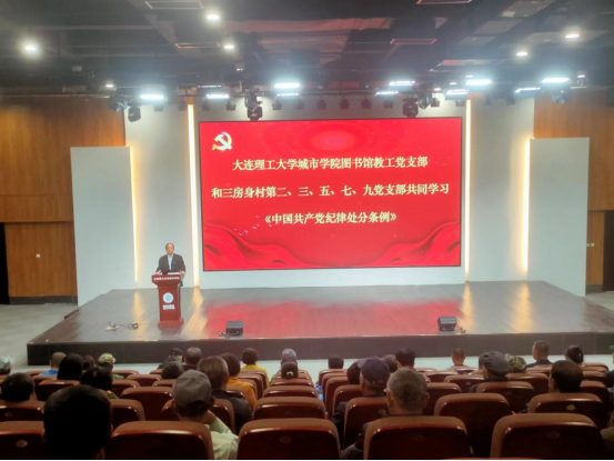 本网讯 4月26日,图书馆教工党支部和三房身村第二、三、五、七、九党支部于图书馆报告厅共同学习《中国共产党纪律处分条例》。(下称《条例》)图书馆教工党支部书记徐其怀领学,三房身村党总支副书记王娜作总结发言。