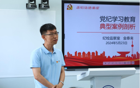 纪检监察室主任金泰来以《党纪学习教育典型案例剖析》为题,围绕《戒尺》收录的17个违法违纪典型案例与全体党员干部开展了研讨和交流。他从政治、组织、廉洁、工作作风、生活纪律等多个维度,对案例进行了全面而深入地剖析,用身边事教育身边人,为党员们上了一堂生动的纪律党课。