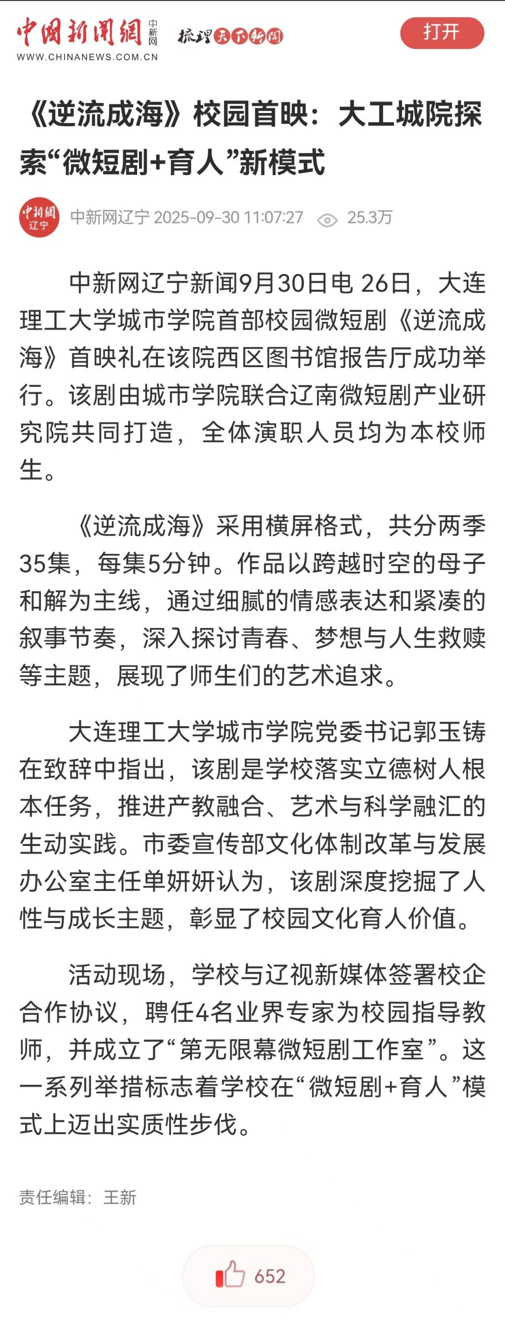 中国新闻网:《逆流成海》校园首映:大工城院探索“微短剧+育人”新模式