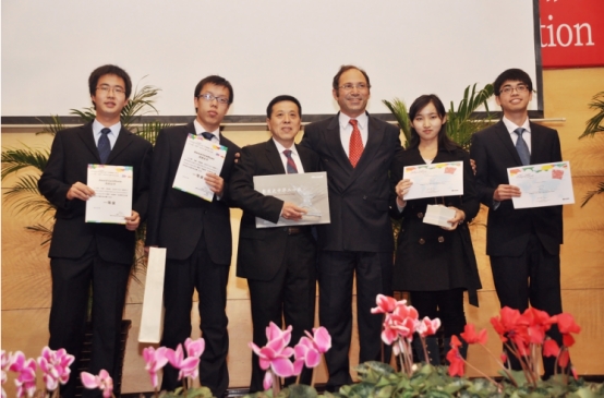获“微软创新杯”全国总决赛冠军后,简雅楠和她的导师、队友从微软全球副总裁瓦赫•托罗西安手里接过参加全球总决赛的邀请函后合影。钱浩飞摄