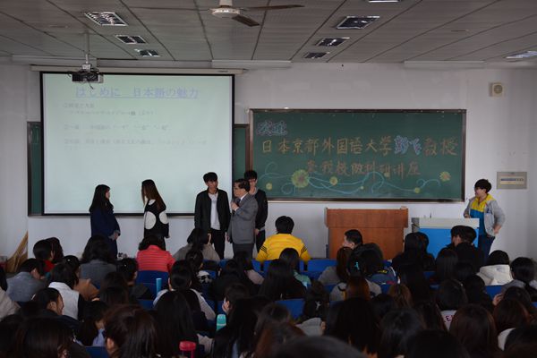 讲座中,彭飞教授始终保持着与全场学生的互动,数十位学生走上讲台,与教授交流沟通,共同演绎日语的常规对话,讲座现场笑声不断、气氛十分热烈。同学们都表示受益匪浅,意犹未尽。彭教授的幽默、睿智的讲述加深了大家对日语学习的兴趣。另外,许多同学还得到了彭教授赠与的《88人畅谈学地道的日语》一书。彭教授希望同学们拓宽自己的视野,除了学习日语、中文外,还可以了解其他国家语言习惯的对比学习和研究,多途径、多思维去认识和掌握知识,努力成为优秀的日本语言学习者。