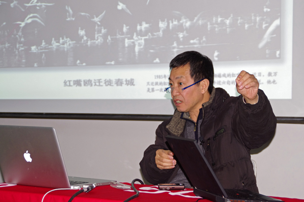 晚6时许,讲座正式开始。贺延光老师首先向大家介绍了新闻摄影的要求与技巧,并融入自己的感悟和观点。贺老师认为,新闻摄影工作者不应该只会拍照,应该具有开阔的眼界,深刻的领悟能力,还要清楚地认识社会现实与历史背景,更重要的是拍摄的视角要“与众不同”。接着,他生动地讲述了自己从事摄影记者工作30年多来记忆深刻又充满传奇色彩的亲身经历,不由得使现场观众肃然起敬。最后,他向大家展示了自己的部分新闻摄影作品,从早期的黑白照片到新时代的数码影像,每一张照片都是一段历史,每一张影像都是一个故事,让同学们在享受视觉冲击的同时开阔视野,增长见识。